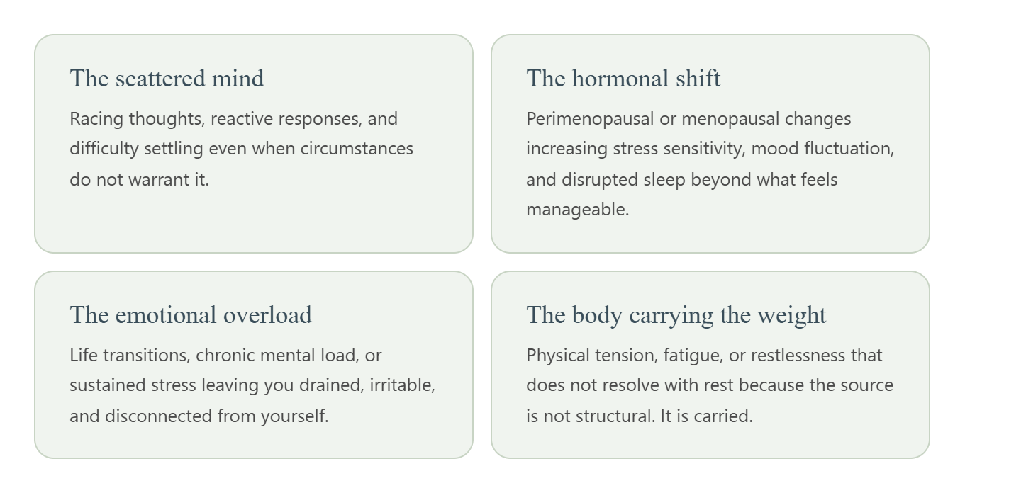 Irritable when you want to be calm. Indecisive when you need to be clear. Overwhelmed when nothing has actually changed. When this internal friction becomes a permanent fixture, managing it is no longer enough. This session is designed for that point.